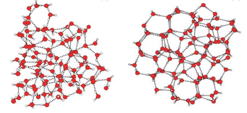 Typical structure of high-density (left) and low-density (right) amorphous ice. Red dots represent the oxygen atoms, and small white circles the hydrogen atoms. Hydrogen bonds are indicated by dashed lines. Coherent structures are absent. From Euclid Consortium: Schirmer et al. 2023, reproduced under CC-BY 4.0 license.