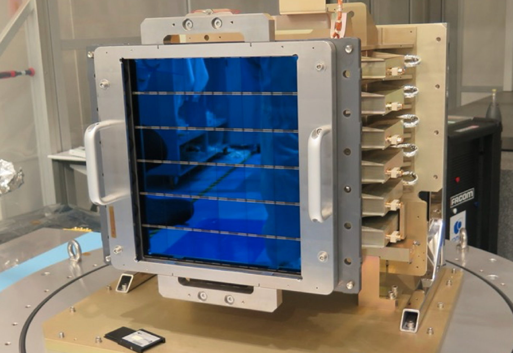 A single NISP HAWAII2RG detector “triplet” including detector chip, read-out electronics, and flexible cable on the left. The right image shows the array of 16 detectors in a test setup where their spatial position is measured to ensure that they lie in the same plane.