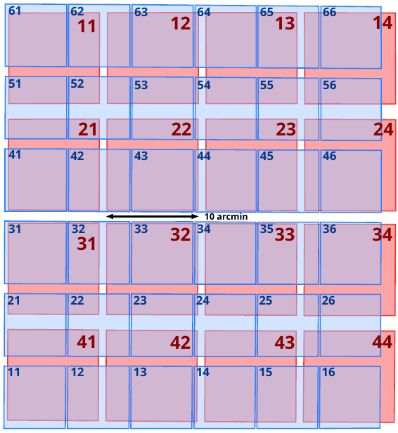 Common footprint of the VIS (blue) and NISP (red) instruments on the sky. The numbers mark the detector names in the VIS and NISP focal plane mosaics.