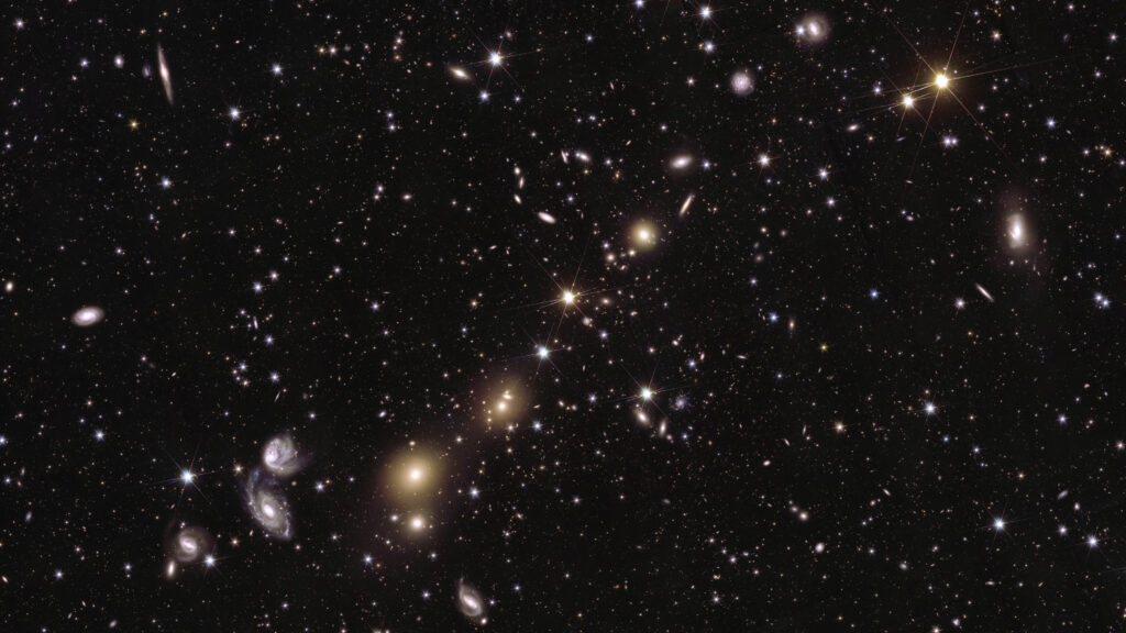 A further zoom into the image shows also larger galaxies – here we start seeing Abell 3381, a galaxy cluster 678 million light years away. All larger galaxies in the Euclid surveys will be subjects to investigate galaxy evolution across cosmic time, or to search for rare objects like supermassive black holes in the earlies times of the cosmos.