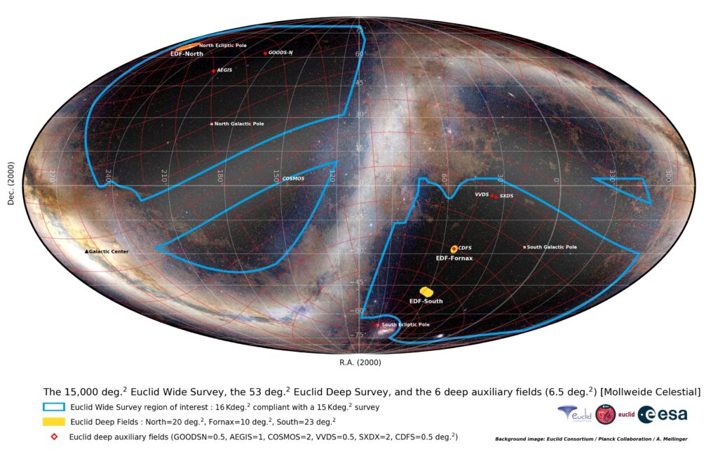 All-sky map in a 2D projection of the Euclid “Region of Interest” in blue, where the Wide Survey will be carried out. The three Euclid Deep Fields are marked in yellow, and popular auxilliary fields in red (Credit: Euclid Consortium Survey Group/J.-C. Cuillandre)
