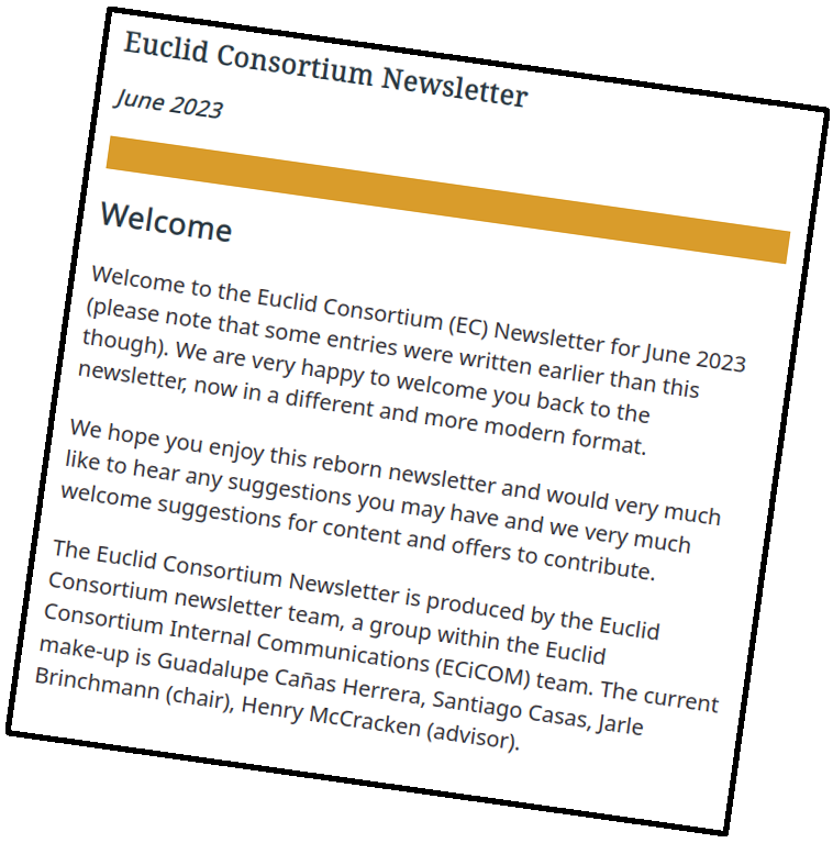 The Euclid Consortium Newsletter is informing in loose succession about news and developments relevant to Euclid, from inside and outside the consortium. Available versions (PDF):
