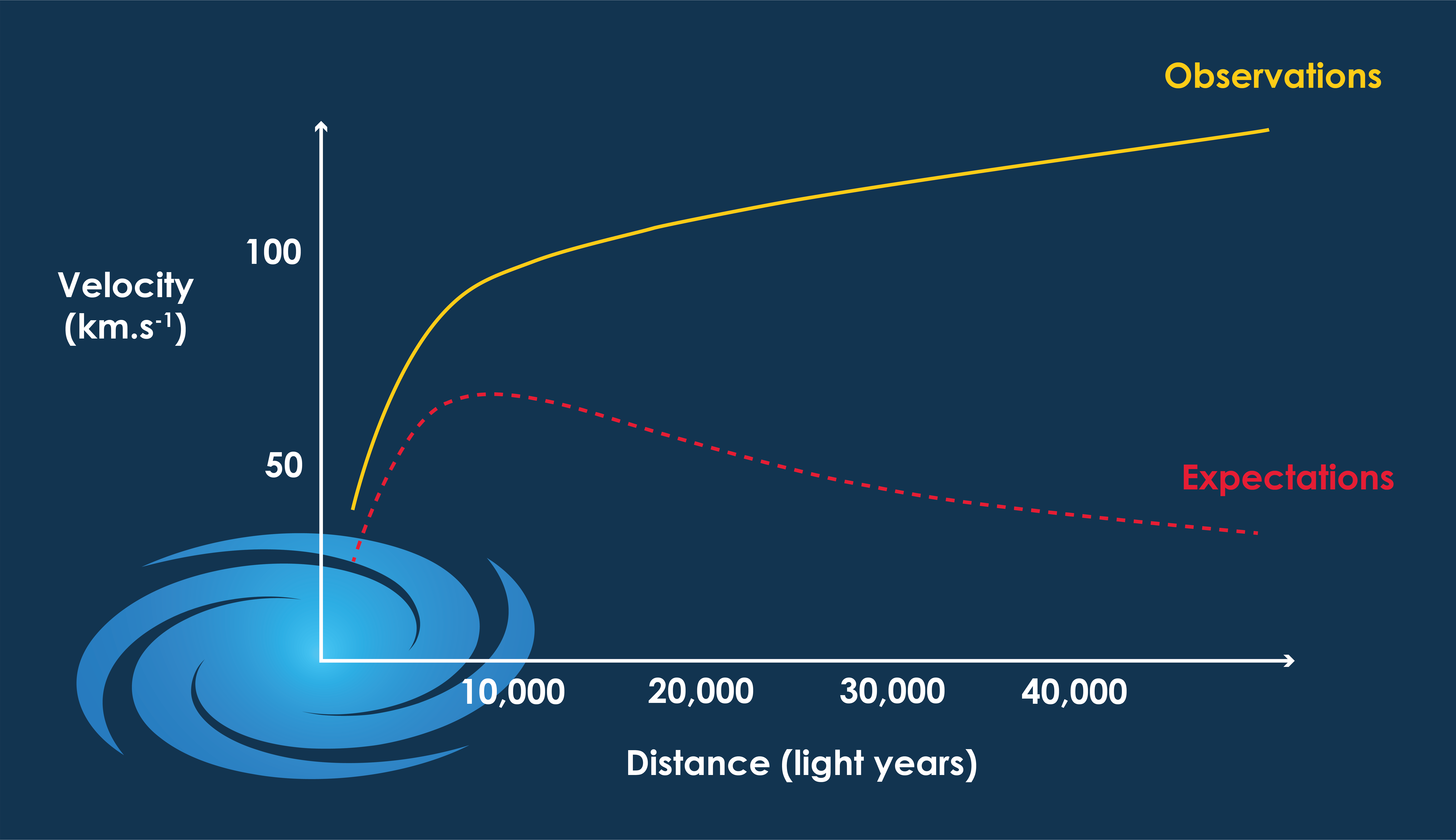 This is a schematics of galaxy rotation curves. The red line corresponds to the expected speed of for example stars moving around a galaxy center calculated with Newton’s equations, predicted from the matter that we can see in the visible disc made of stars and gas. However, what we observe, here in yellow, does not correspond to what we expect, as the outer parts rotate faster. For these regions to rotate so fast, there must be a much larger mass distributed throughout the the galaxy than what we see. Hence the emergence of the dark matter hypothesis, and its name.